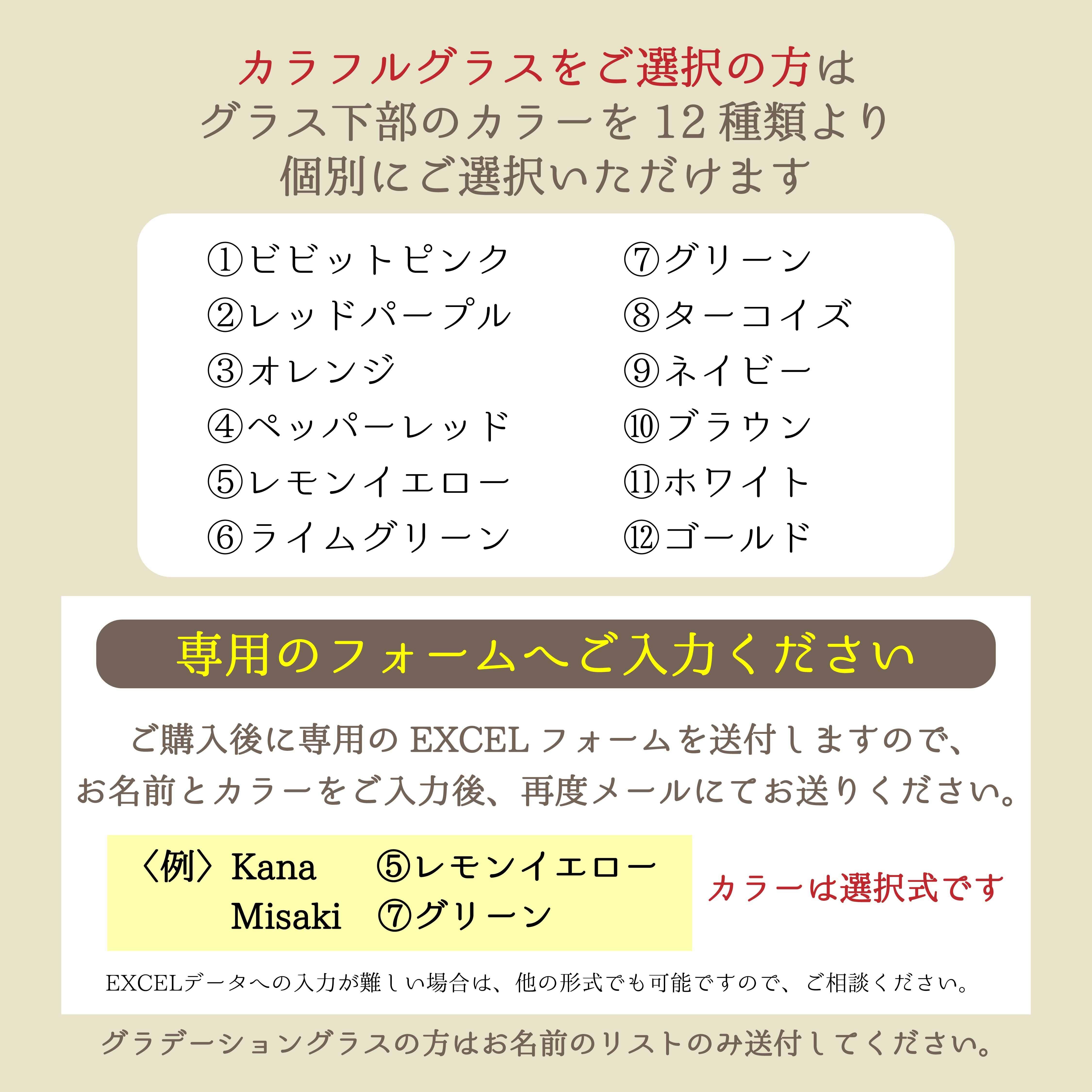 ※カラフルグラスの色は個別に選択いただけますが、フォント及び名入れカラーについては全て同じものでの作成となります。