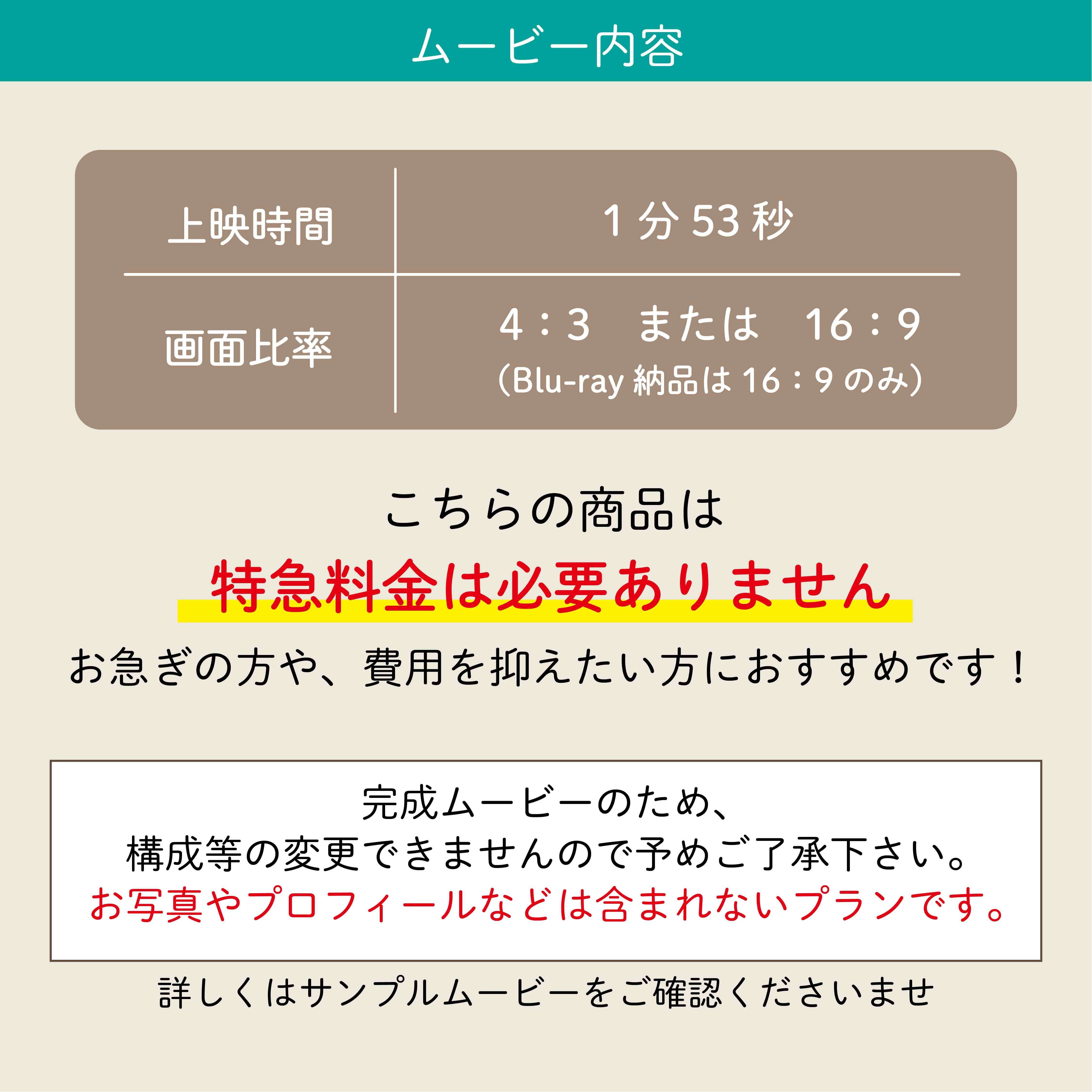 【注意】こちらの商品は完成ムービーのため、構成等の変更できませんので予めご了承下さい。お写真やプロフィールなどは含まれないプランです。