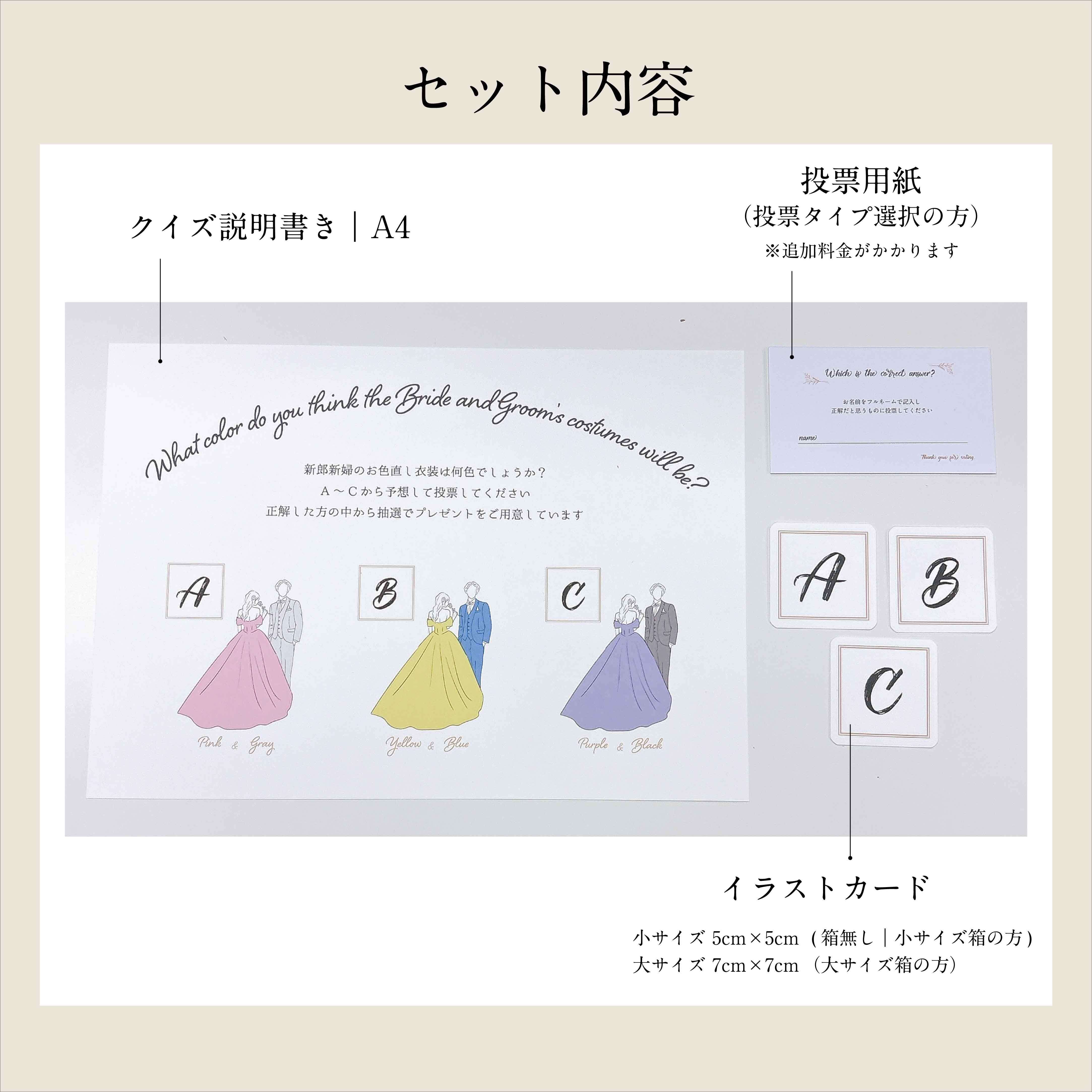 クイズの説明書きと、投票箱や箱につけられるカードのセットです。