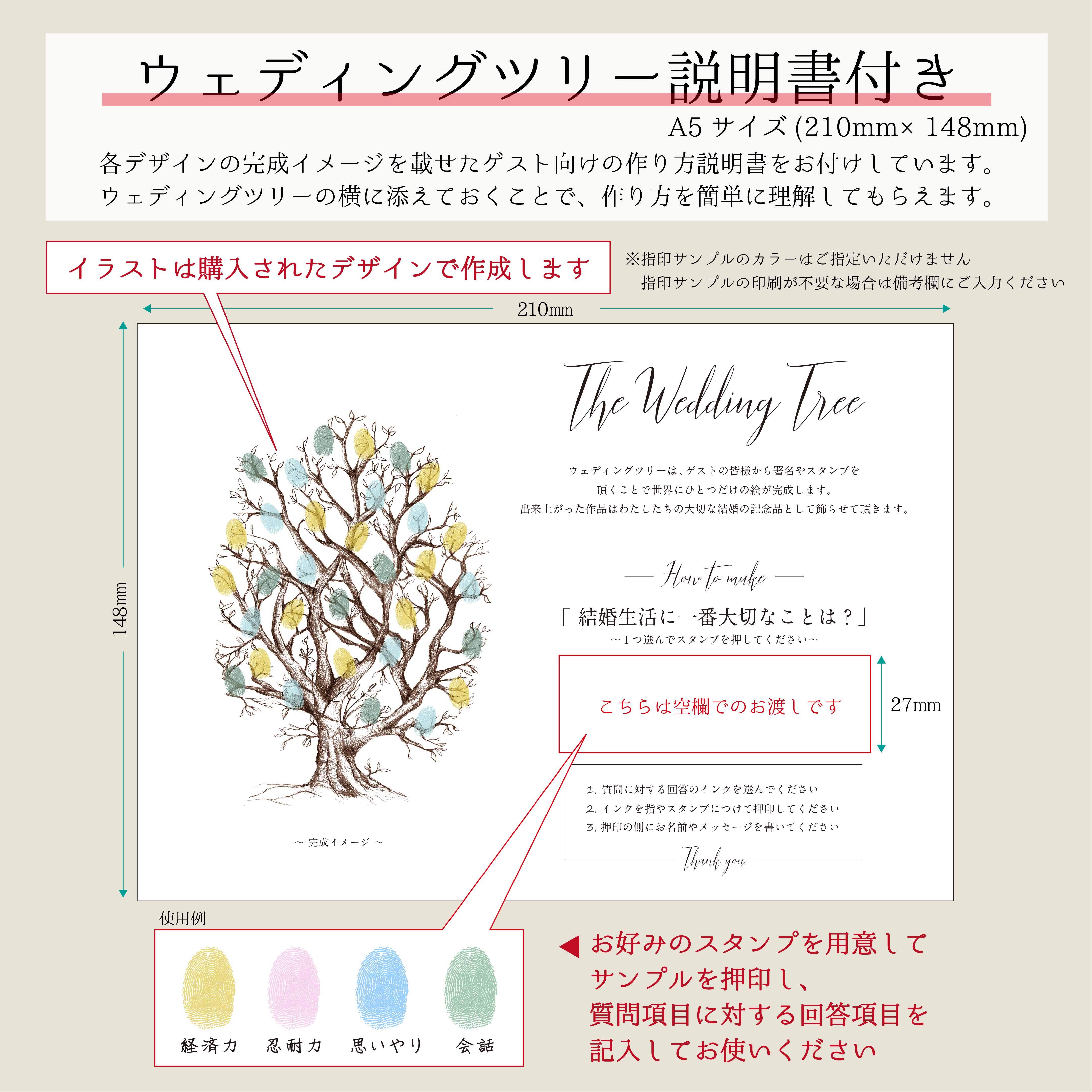 ・作品と同じイラストが描かれたウェディングツリー説明書(A5サイズ)を1枚無料でお付けいたします。デザインについてはオプションより選択ください。